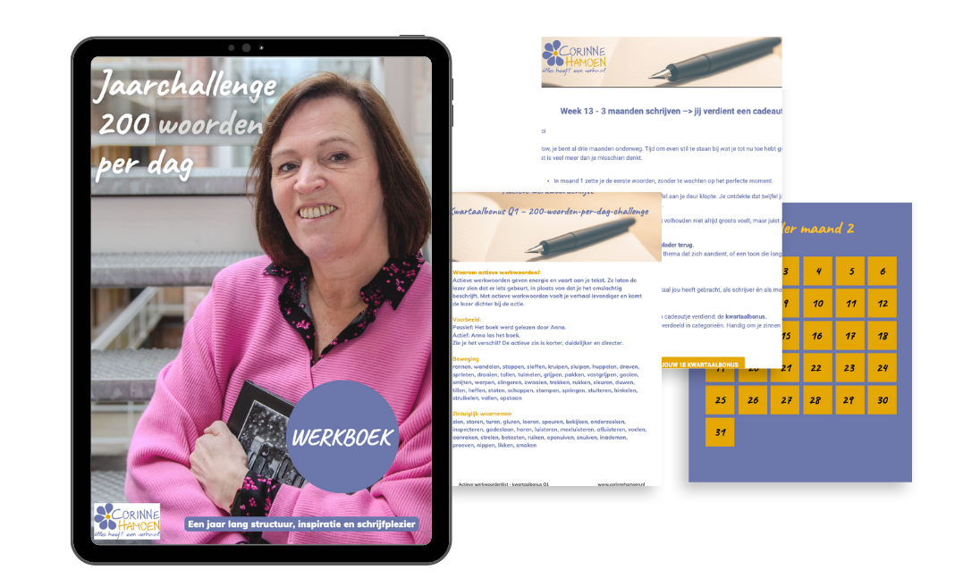 Met deze challenge bouw je in 365 dagen een vaste schrijfroutine op, ontdek je je eigen schrijfstem en werk je stap voor stap aan een compleet boek of levensverhaal. Je hoeft niet te weten waar je verhaal heen gaat, het mag ontstaan terwijl je schrijft.